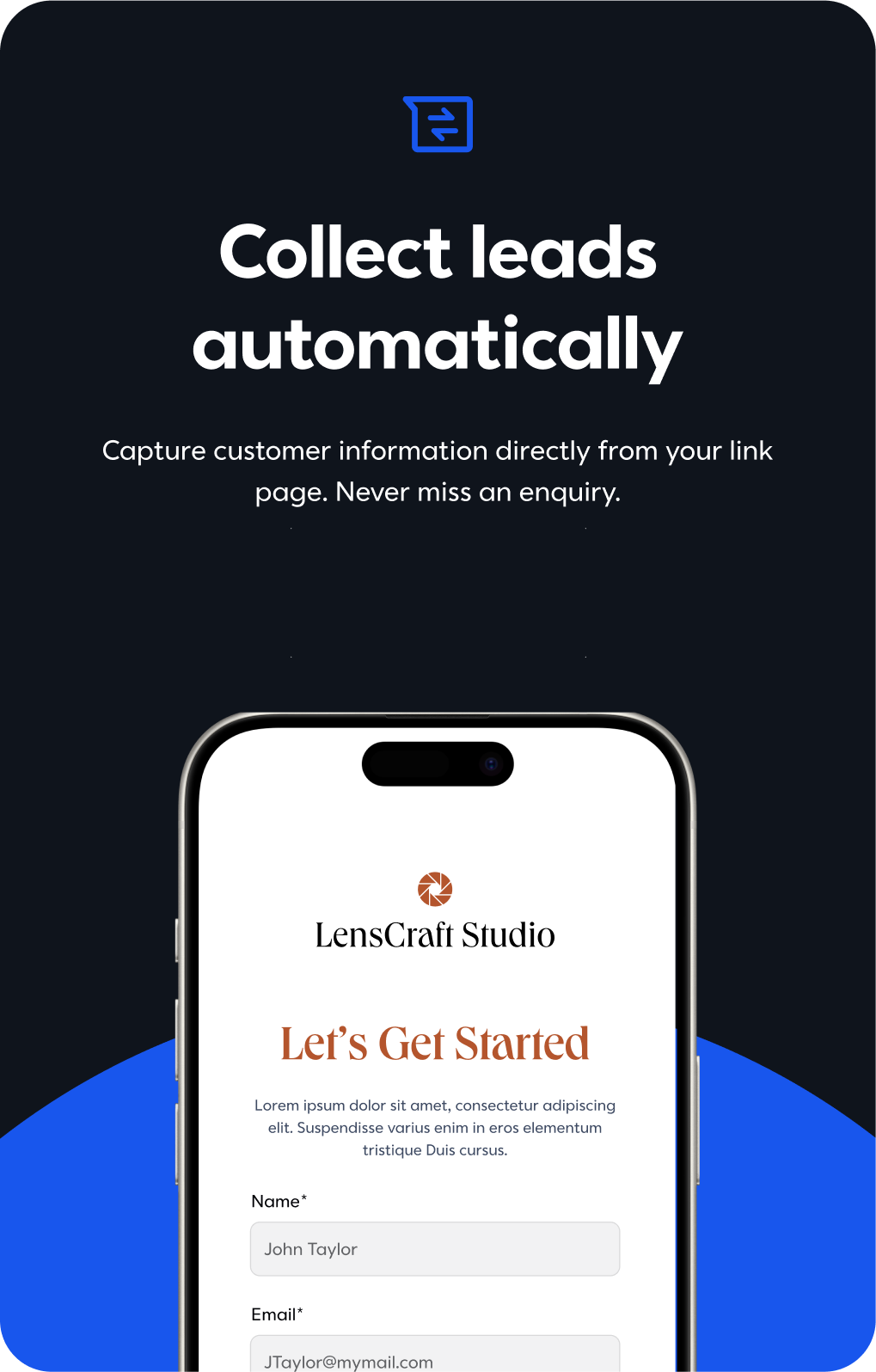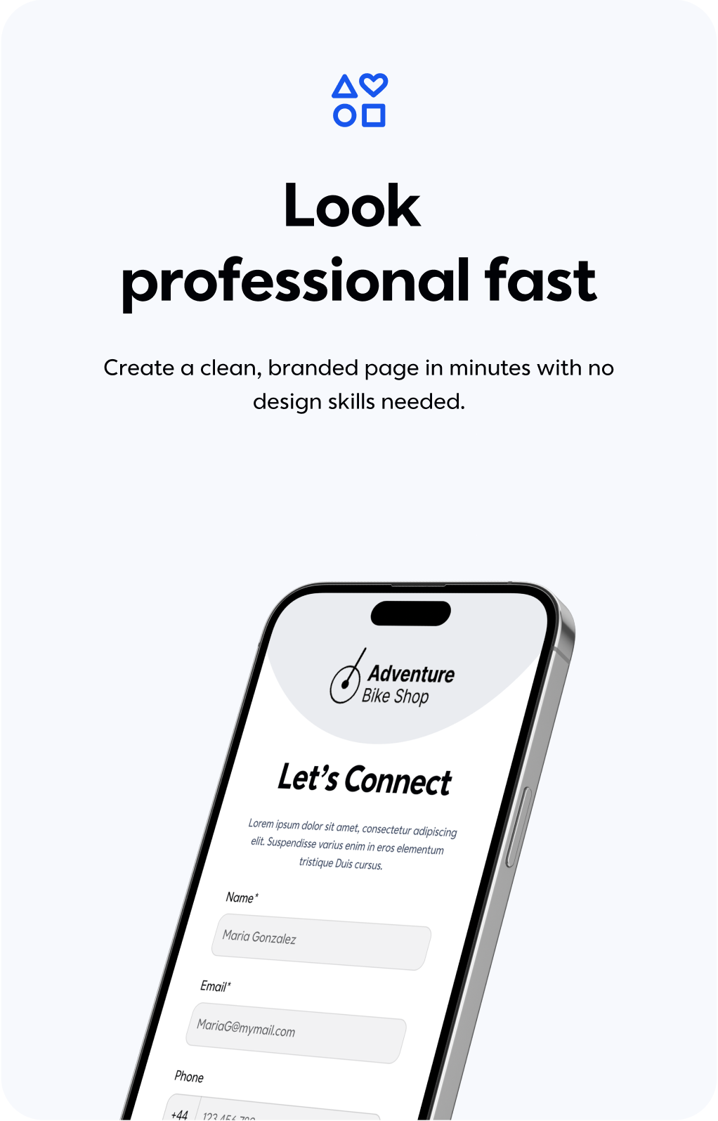 Create a contact form, survey, or link page in minutes. Share it anywhere. Get notified instantly when someone fills it out.